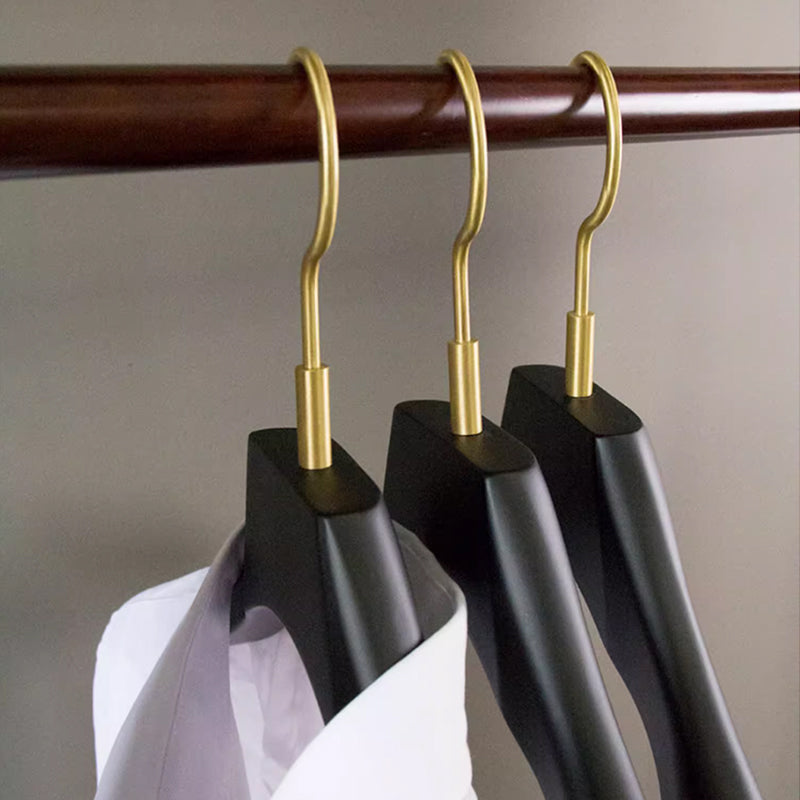 Natural black beech wood solid wood hangers with wide shoulders and thick brass hooks offer a premium, non-slip storage solution for hotels, home closets, and boutique displays. Designed for adult men’s and women’s clothing, these durable wooden coat hangers prevent shoulder marks, support heavy garments, and add a luxury touch to wardrobes and retail spaces.