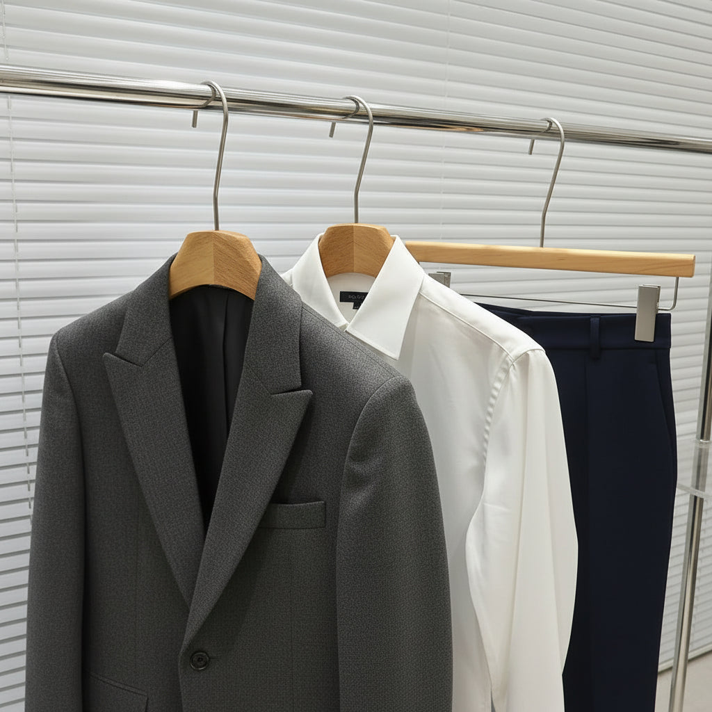 Premium Wooden Hangers for Boutiques, Clothing Stores & Hotels - Natural oak finish solid wood hangers with non-slip design, perfect for displaying coats, suits, dresses, and pants in retail stores, boutique shops, and luxury hotel closets.